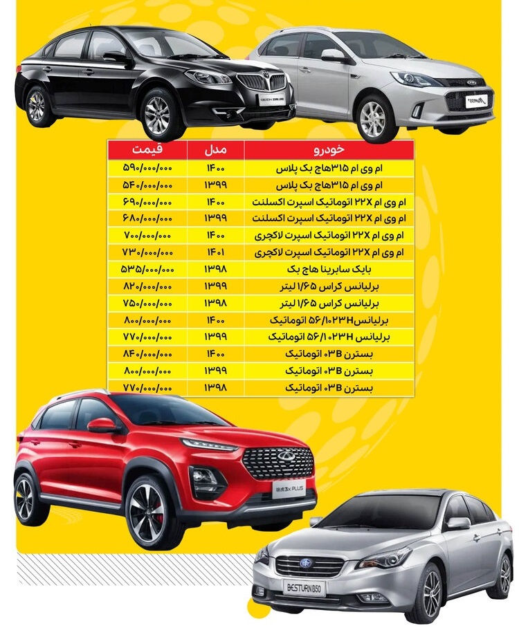 | هایما S5 توربو | یک میلیارد و 65 میلیون | یک میلیارد و 65 میلیون |