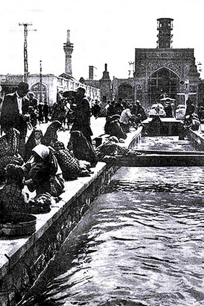 این قدیمیترین عکسی است که از حرم مطهررضوی ثبت شده و در مجموعهی آستان قدس رضوی موجود است. اینجا نهر خیابان و صحن سقاخانهی عتیق (انقلاب فعلی) حرم امام رضا(ع) در سال ۱۲۳۳ هجری شمسی است. یعنی حدود ۱۶۰ سال پیش. آنتونیو جیانوزی، از عکاسان خارجی عصر قاجاریان عکاس این عکس است.