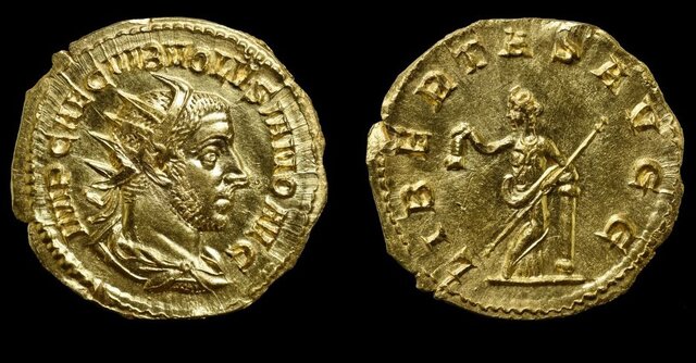 این سکه طلا حدود ۵.۶ گرم وزن دارد و در فاصله بین ۲۵۱ تا ۲۵۳ میلادی تولید شده است. روی یک وجه از این سکه، چهره امپراتوری با ریش و تاج وجود دارد و روی سمت دیگر «لیبرتاس» نماد آزادی دیده میشود.