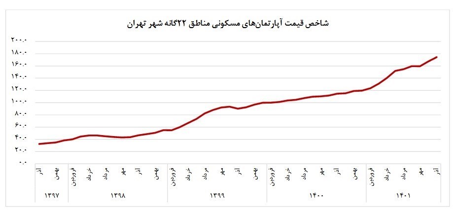 در آذر ماه 1401 شاخص قیمت آپارتمان های مسکونی شهر تهران به عدد 174.3 رسیده است که نسبت به ماه قبل (167.4)، 4.1 درصد افزایش داشته است.