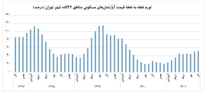 نرخ تورم سالانه آذر ماه 1401 آپارتمانهای مسکونی شهر تهران به عدد 37.1 درصد رسیده است که نسبت به همین اطلاع در ماه قبل(35 درصد)، 2.1 واحد درصد افزایش داشته است.