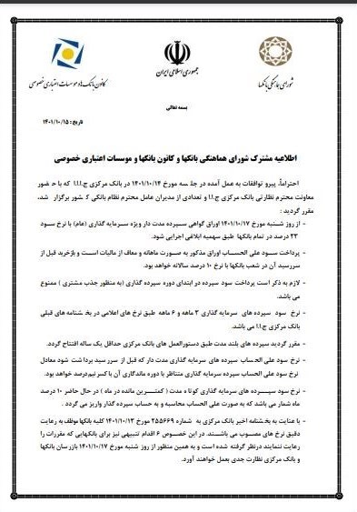 شورای هماهنگی بانکها و کانون بانکها و موسسات اعتباری خصوصی در همین ارتباط با صدور اطلاعیهای مشترک از به توافقات به عمل آمده بین بانکها در جلسه مورخ 1401/10/14 در بانک مرکزی با حضور معاونت نظارتی بانک مرکزی ج.ا.ا و تعدادی از مدیران عامل نظام بانکی کشور خبر دادند.