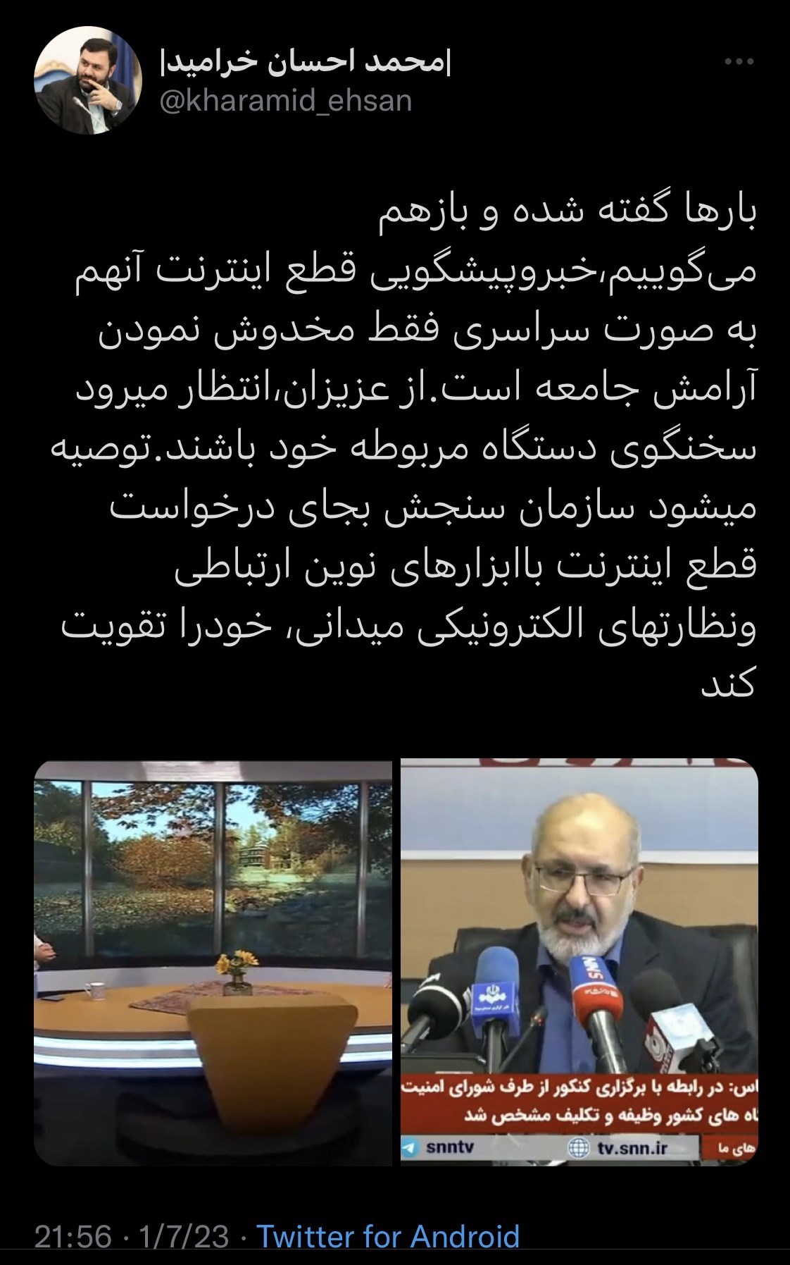 اما در ادامه ساعاتی پیش «محمد احسان خرامید»، مشاور وزیر و رئیس مرکز اطلاع‌رسانی و روابط عمومی وزارت ارتباطات، در توییتی در صفحه شخصی خود محتوایی را مبنی بر شکایت از انتشار سخنان ضد و نقیض درخصوص قطع سراسری اینترنت منتشر ساخت و اذعان داشت: خبر پیشگویی قطع اینترنت آن هم به صورت سراسری فقط مخدوش نمودن آرامش جامعه است. از عزیزان، انتظار می‌رود سخنگوی دستگاه مربوطه خود باشند. توصیه می‌شود سازمان سنجش بجای درخواست قطع اینترنت با ابزارهای نوین ارتباطی و نظارتهای الکترونیکی میدانی، خود را تقویت کند.