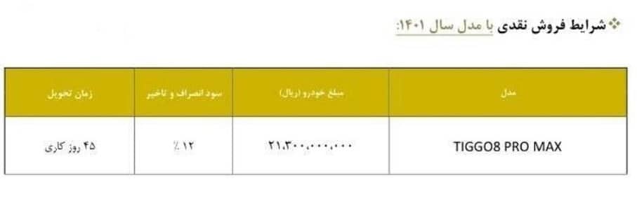 مدیران خودرو در این طرح شاسی بلند دو دیفرانسیل فونیکس تیگو ۸ پرو مکس را با قیمت مصوب ۲ میلیارد و ۱۳۰ میلیون تومان به مشتریان عرضه میکند. این خودرو در قالب طرح فروش نقدی و با موعد تحویل ۴۵ روز کاری به مشتریان عرضه خواهد شد. سود انصراف و تاخیر نیز در این طرح ۱۲ درصد در نظر گرفته شده است.