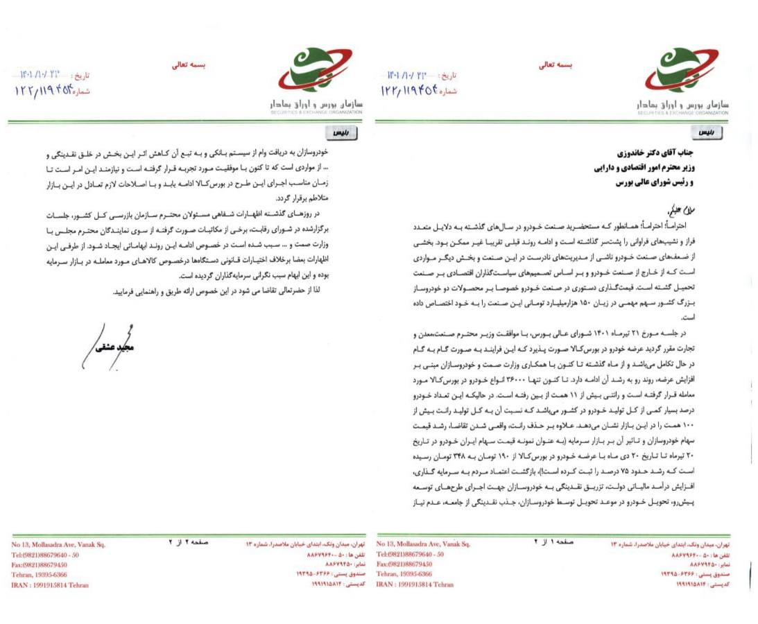 رئیس سازمان بورس و اوراق بهادار در نامه‌ای به وزیر امور اقتصادی و دارایی خواستار اقدام مناسب و فوری برای از بین بردن ابهامات عرضه و فروش خودرو در بورس کالا شد که موجبات نگرانی سهامداران را فراهم آورده است.