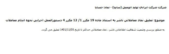 نماد ایران خودرو و سایپا تا تاریخ ۵ بهمن ماه تعلیق شدند.