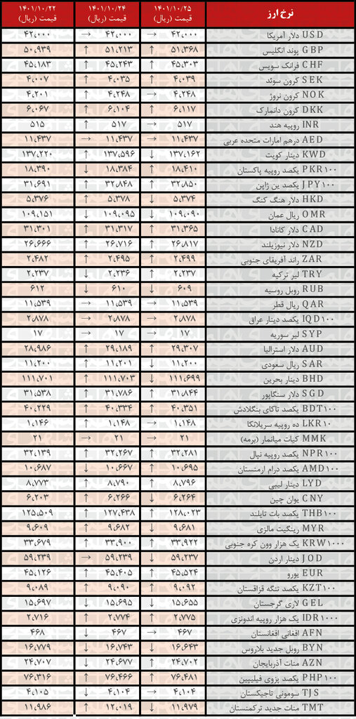 بانک مرکزی امروز نرخ هر دلار را ۴۲ هزار ریال، پوند را ۵۱ هزار و ۳۶۸ و یورو را ۴۵ هزار و ۵۲۴ اعلام کرد.