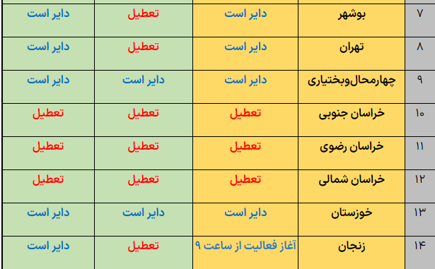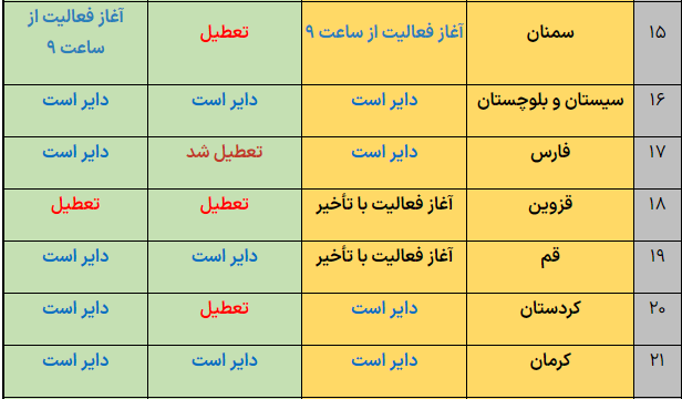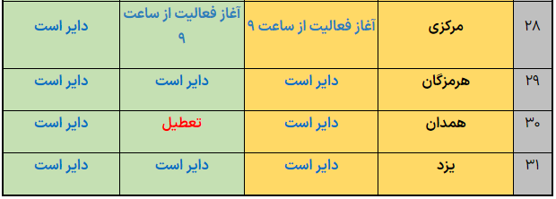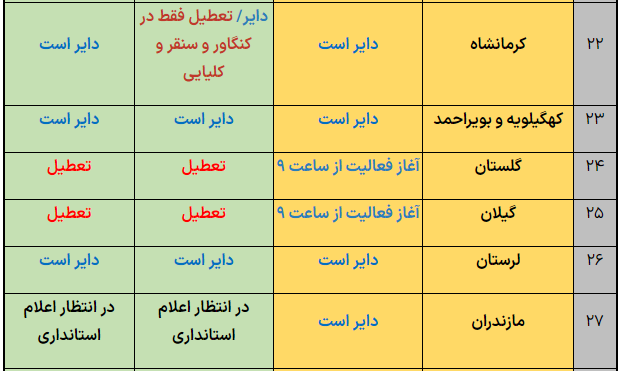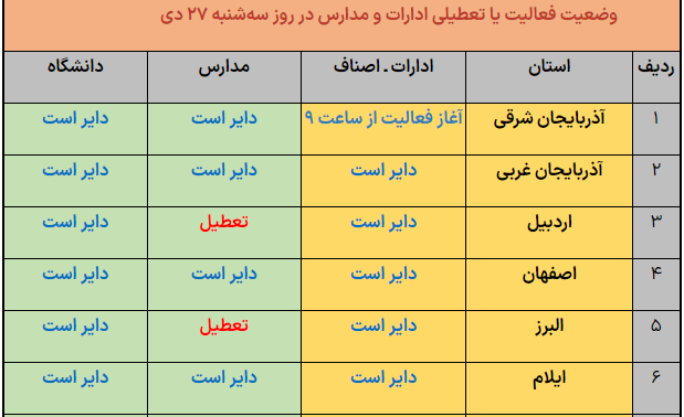 ادارات و مدارس این استان ها فردا سه شنبه ۲۷ دی ماه تعطیل است
