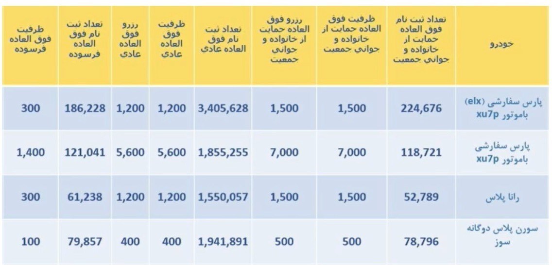 در طرح فروش فوق العاده 4 محصول ایران خودرو که تا 25 دی ماه ادامه داشت، سورن پلاس دوگانه سوز، پژوپارس سال با موتور XU و رانا پلاس برای سه گروه متقاضی عادی، طرح مادران و خودروهای فرسوده عرضه شده است.