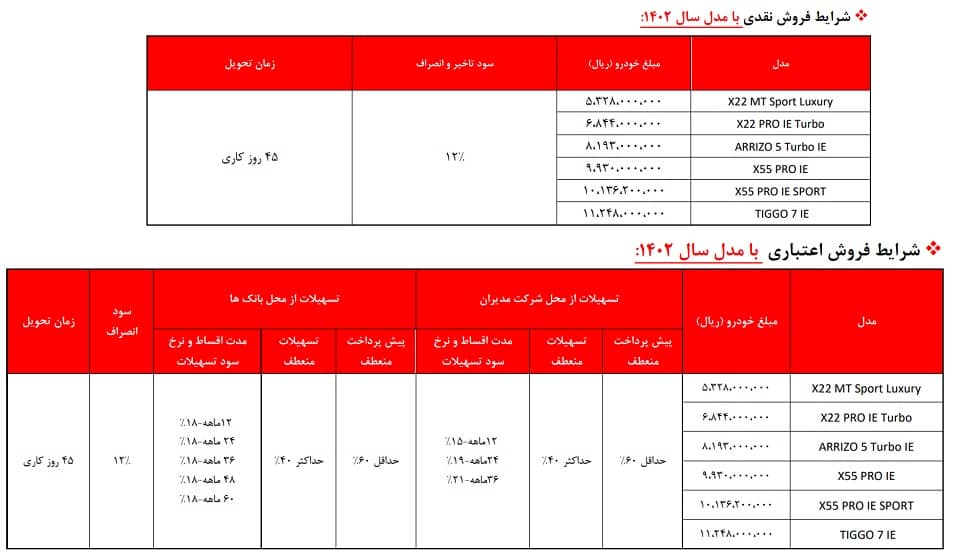 در این طرح فروش، ام وی ام ایکس 22 MT اسپرت لاکچری با قیمت ۵۳۲ میلیون و ۸۰۰ هزار تومان، ام وی ام ایکس 22 پرو IE توربو با قیمت ۶۸۴ میلیون و ۴۰۰ هزار تومان، آریزو 5 توربو IE با قیمت ۸۱۹ میلیون و ۳۰۰ هزار تومان، ام وی ام ایکس 55 پرو IE با قیمت ۹۹۳ میلیون تومان، ام وی ام ایکس 55 پرو IE اسپرت با قیمت ۱ میلیارد و ۱۳ میلیون و ۶۲۰ هزار تومان و تیگو 7 IE با قیمت ۱ میلیارد و ۱۲۴ میلیون و ۸۰۰ هزار تومان به فروش میرسند.