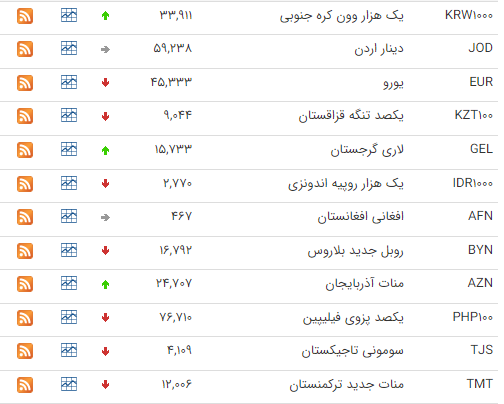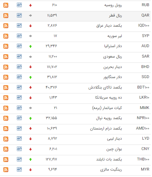بر این اساس نرخ رسمی پوند انگليس، یکصد ين ژاپن، دلار کانادا و دلار استراليا افزایش و نرخ یورو، لير ترکيه، يکصد دينار عراق و یوان چين کاهش یافت.