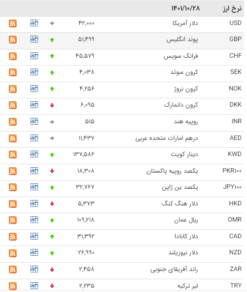 بانک مرکزی امروز چهارشنبه (۲۸ دی)، نرخ هر دلار را ۴۲ هزار ریال، پوند را ۵۱ هزار و ۴۹۹ و یورو را ۴۵ هزار و ۳۳۳ اعلام کرد.