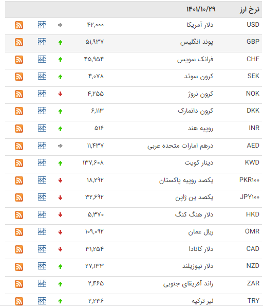 بانک مرکزی امروز پنجشنبه (۲۹ دی)، نرخ هر دلار را ۴۲ هزار ریال، پوند را ۵۱ هزار و ۹۳۷ و یورو را ۴۵ هزار و ۴۷۵ ریال اعلام کرد.