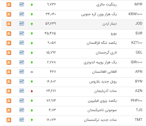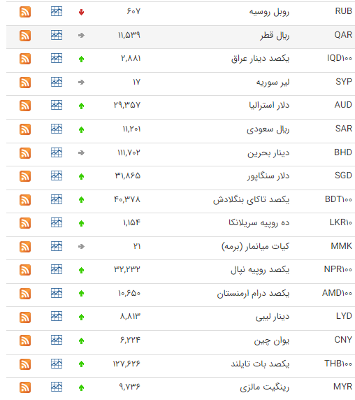 بر این اساس نرخ رسمی پوند انگليس، یورو، لير ترکيه، يکصد دينار عراق، دلار استراليا و یوان چين افزایش و نرخ یکصد ين ژاپن و دلار کانادا کاهش یافت.