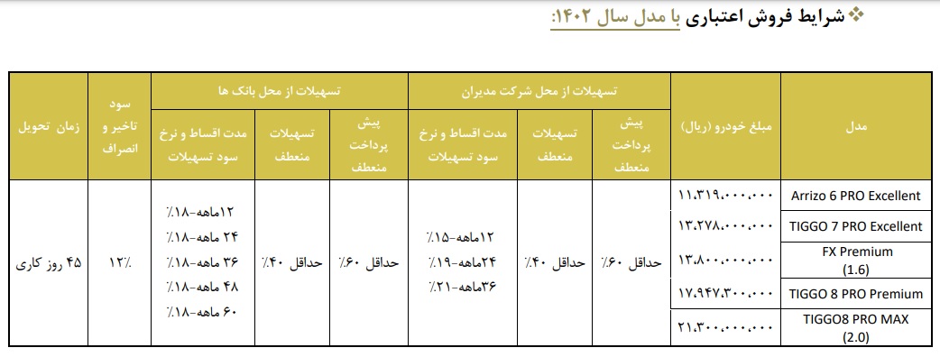 شرایط فروش اقساطی محصولات چری با مدل 1402 در نمایندگی های مجاز این شرکت اعلام شد.