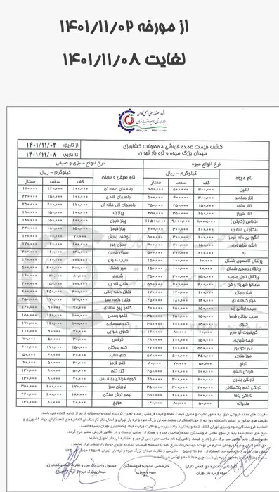 رییس اتحادیه مرکزی میوه و ترهبار تهران اظهار داشت: نرخ هر کیلوگرم انار دماوند بین ۳۰ تا ۵۰ هزار تومان، انار ساوه بین ۱۵ تا ۳۵ هزار تومان، انار شیراز بین ۲۵ تا ۴۵ هزار تومان، ازگیل بین ۳۰ تا ۷۵ هزار تومان، خرمالو شهریار و کن بین ۳۰ تا ۵۵ هزار تومان، انگور بیدانه قرمز بین ۲۰ تا ۵۰ هزار تومان، انگور بیدانه زرد بین ۲۰ تا ۴۰ هزار تومان، انگور شاهرودی بین ۱۵ تا ۳۰ هزار تومان، بِه بین ۲۰ تا ۵۰ هزار تومان، سیب لبنانی زرد بین ۱۵ تا ۴۰ هزار تومان، سیب لبنانی قرمز بین ۱۵ تا ۳۵ هزار تومان، کیوی بین ۱۵ تا ۳۵ هزار تومان به فروش میرسد.