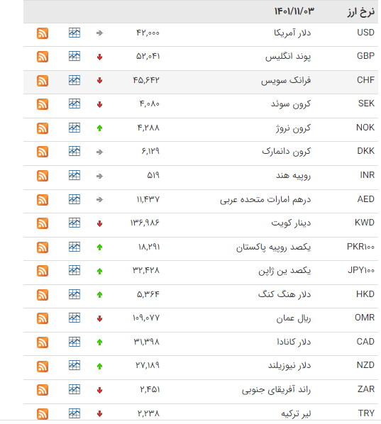 بانک مرکزی امروز دوشنبه (۳ بهمن)، نرخ هر دلار را ۴۲ هزار ریال، پوند را ۵۲ هزار و ۴۱ و یورو را ۴۵ هزار و ۵۹۳ اعلام کرد.