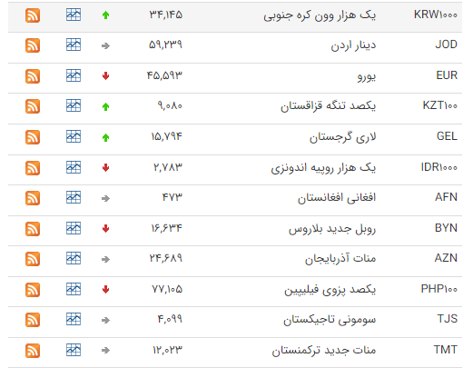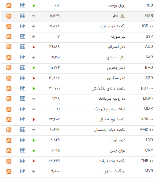 نرخ رسمی درهم امارات متحده عربی، افغانی افغانستان و يکصد دينار عراق هم بدون تغییر باقی ماند.