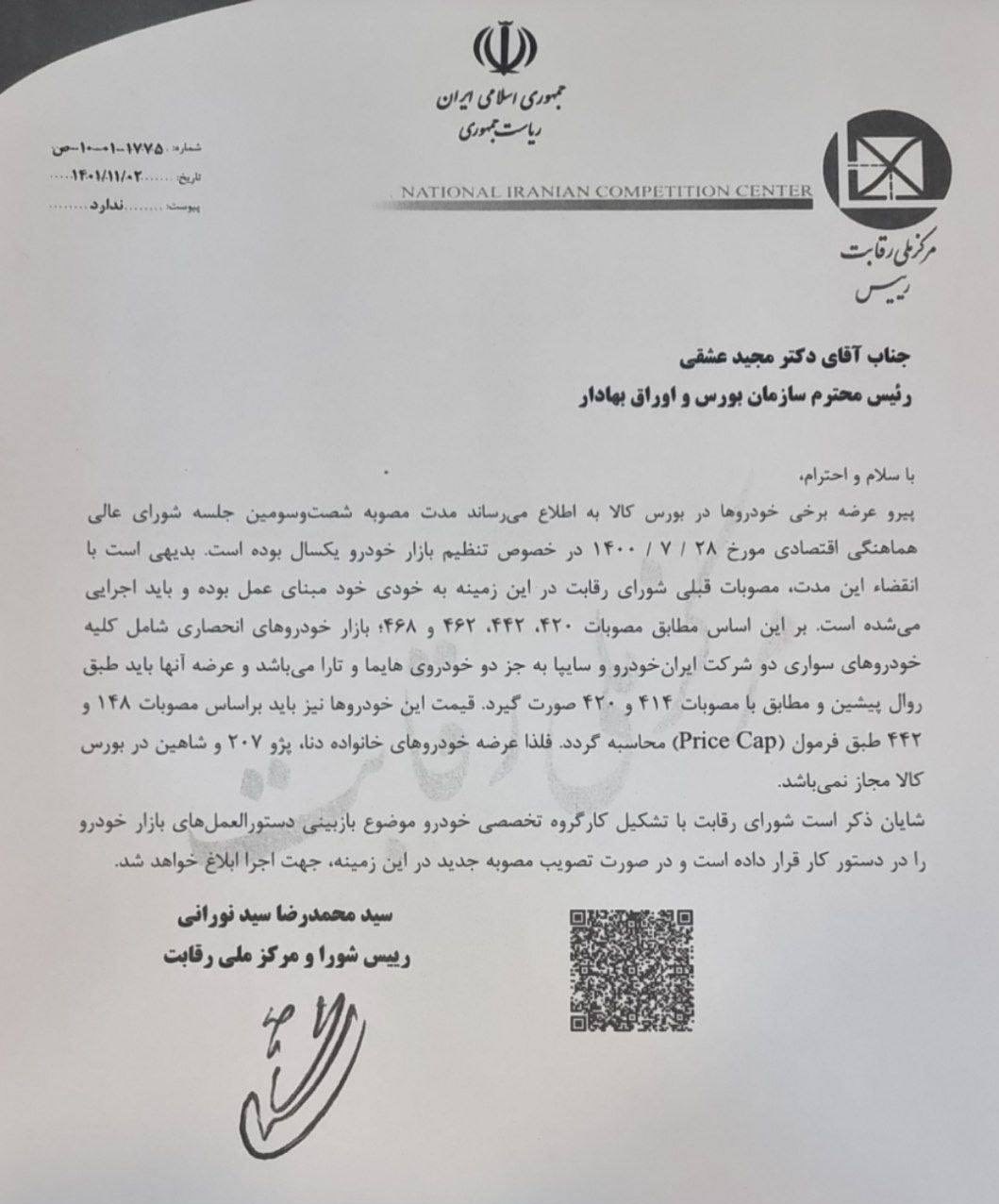 در این نامه آمده است:پیرو عرضه برخی خودروها در بورس کالا به اطلاع میرساند مدت مصوبه شصت و سومین جلسه شورایعالی هماهنگی اقتصادی مورخ 28/ 7/ 1400 در خصوص تنظیم بازار خودرو یک سال بوده است.