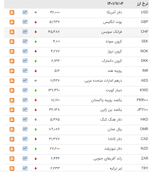 به گزارش خبرگزاری صداوسیما، بانک مرکزی امروز سه شنبه (۴ بهمن)، نرخ هر دلار را ۴۲ هزار ریال، پوند را ۵۱ هزار و ۹۳۷ و یورو را ۴۵ هزار و ۶۲۳ ریال اعلام کرد.