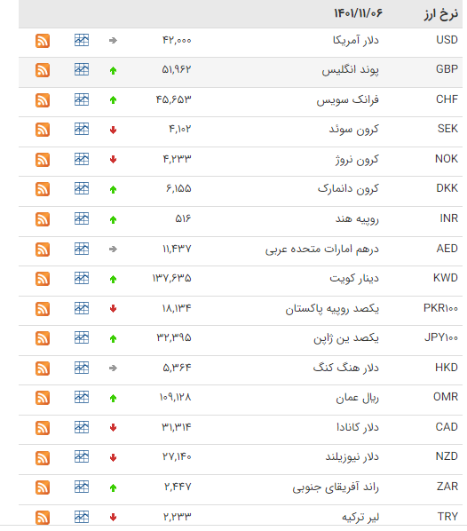 بانک مرکزی امروز پنجشنبه (۶ بهمن)، نرخ هر دلار را ۴۲ هزار ریال، پوند را ۵۱ هزار و ۹۶۲ و یورو را ۴۵ هزار و ۷۸۰ اعلام کرد. برا اين اساس نرخ رسمي پوند انگليس، یورو، یکصد ين ژاپن، دلار استراليا، یوان چين و افغانی افغانستان افزايش و نرخ دلار کانادا و لير ترکيه كاهش يافت.