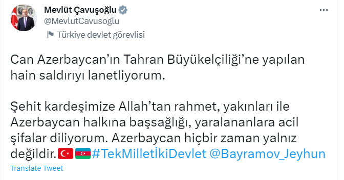 به گزارش سایت طلا از خبرگزاری آناتولی، مولود چاووشاوغلو، وزیر امور خارجه ترکیه با انتشار پیامی در حساب رسمی کاربری خود در توئیتر نوشت حمله به سفارت جمهوری آذربایجان در تهران را محکوم میکنیم.