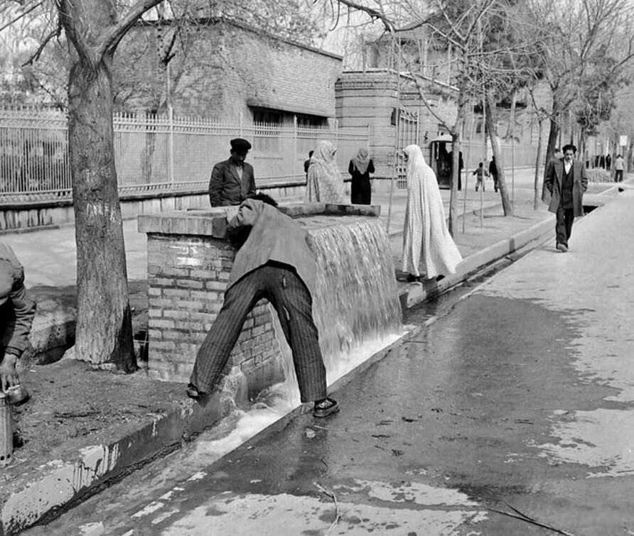 تصویر مربوط به یک قنات در خیابان حافظ است که شخصی برای رفع تشنگی از آن آب می‌خورد.