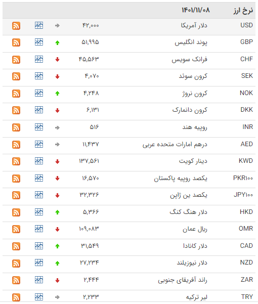 بانک مرکزی امروز شنبه (۸ بهمن)، نرخ هر دلار را ۴۲ هزار ریال، پوند را ۵۱ هزار و ۹۹۵ و یورو را ۴۵ هزار و ۶۰۴ ریال اعلام کرد.