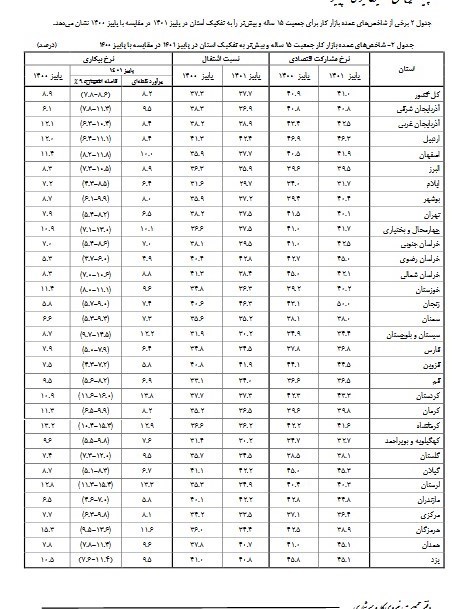 در پاییز ۱۴۰۱ کمترین نرخ بیکاری برای استان خراسان رضوی با ۴.۹ درصد و بیشترین میزان نرخ بیکاری برای کردستان با ۱۳.۸ درصد ثبت شده است.
