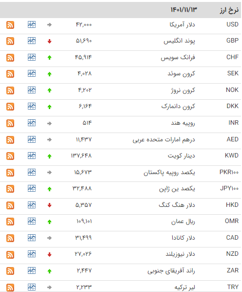 بانک مرکزی امروز پنج شنبه (۱۳ بهمن)، نرخ هر دلار را ۴۲ هزار ریال، پوند را ۵۱ هزار و ۶۹۰ و یورو را ۴۵ هزار و ۸۵۶ ریال اعلام کرد.