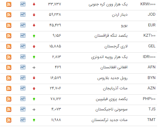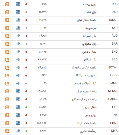 بر این اساس نرخ رسمی پوند انگليس، یورو، یکصد ين ژاپن، دلار کانادا، لير ترکيه، يکصد دينار عراق، دلار استراليا و یوان چين کاهش یافت.