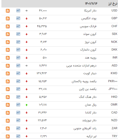 بانک مرکزی امروز یکشنبه (۱۶بهمن)، نرخ هر دلار را ۴۲ هزار ریال، پوند را ۵۰ هزار و ۶۱۲ ریال و یورو را ۴۵ هزار و ۴۲۹ ریال اعلام کرد.