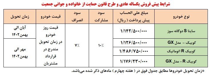 در این طرح، چهار محصول ساینا S دوگانهسوز، کوییک مدل GX، کوییک R اتوماتیک و کوییک R مدل GX در قالب طرح پیش فروش یکساله برای مادران دارای دو فرزند و بیشتر عرضه میشود.