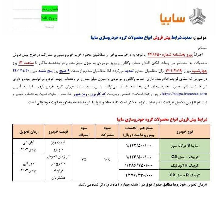پیش از این مهلت ثبت نام در طرح پیش فروش سایپا تا روز 18 بهمن 1401 بود که با بخشنامه جدید این شرکت این طرح تا 19 بهمن 1401 ادامه دارد.
