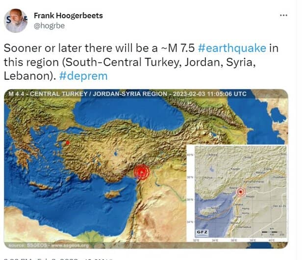 فرانک هوگربیتس، یک محقق هلندی که در حوزه مطالعات ژئومتری منظومه شمسی (SSGEOS) و بررسی مباحث ژئوفیزیک فعالیت میکند، 3 روز قبل یعنی در تاریخ 14 بهمن ماه (3 فوریه) این اتفاق وحشتناک را پیشبینی کرده بود. وی در حساب کاربری خود در توییتر، از زلزله ترکیه و همچنین سوریه و دیگر کشورها خبر داده بود؛ محققی توییتری که پیشبینیهای ترسناکاش درست از آب درآمد!
