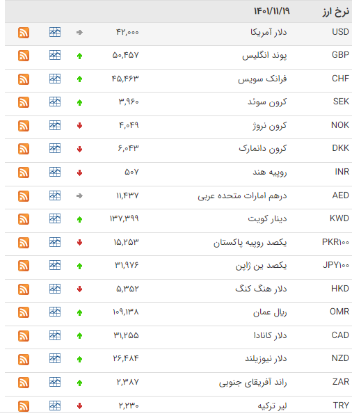 بانک مرکزی امروز چهارشنبه (۱۹ بهمن)، نرخ هر دلار را ۴۲ هزار ریال، پوند را ۵۰ هزار و ۴۵۷ ریال و یورو را ۴۴ هزار و ۹۶۹ ریال اعلام کرد.