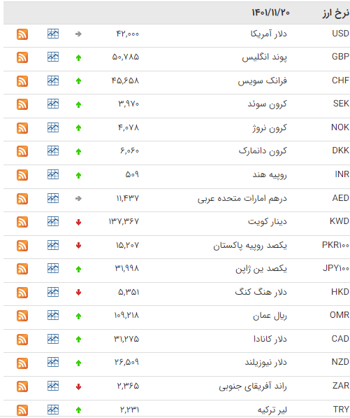 بانک مرکزی امروز پنج شنبه (۲۰ بهمن)، نرخ هر دلار را ۴۲ هزار ریال، پوند را ۵۰ هزار و ۷۸۵ و یورو را ۴۵ هزار و ۸۵ ریال اعلام کرد.
