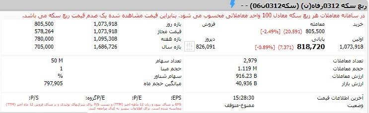 قیمت پایانی معاملات دیروز نیز با افت 89 صدم درصدی به 8 میلیون و 187 هزار تومان رسید.