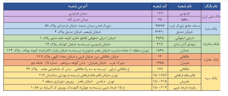 شعب منتخب پنج بانک مذکور به شرح جدول زیر است.