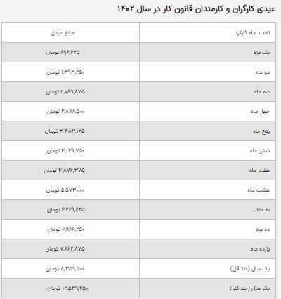 جدول زیر میزان دریافت عیدی برای کارگرانی که کمتر از یک سال سابقه کار را دارند روشن کرده است.