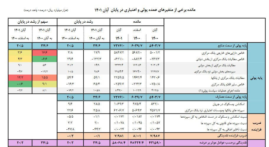نرخ رشد نقدینگی در ۱۲ ماه منتهی به آبان ماه ۱۴۰۱ نسبت به سال قبل از آن ۳۴.۵ درصد و در آبان ماه ۱۴۰۱ نسبت به اسفند ۱۴۰۰ نیز ۲۰.۲ درصد رشد داشت.