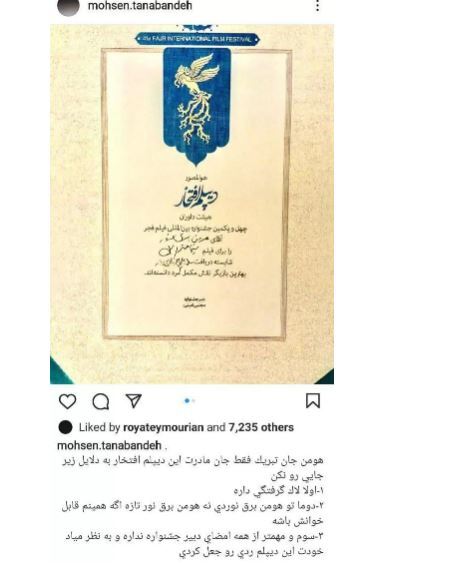 گفتنی است محسن تنابنده با انتشار تصویری از دیپلم افتخار هومن برق‌نورد که در مراسم اختتامیه جشنواره فیلم فجر ۴۱ به این بازیگر اهدا شد، نوشت: هومن جان تبریک، تو شایسته بهترین‌هایی، فقط جان مادرت این دیپلم افتخار را به دلایل زیر جایی رو نکن: