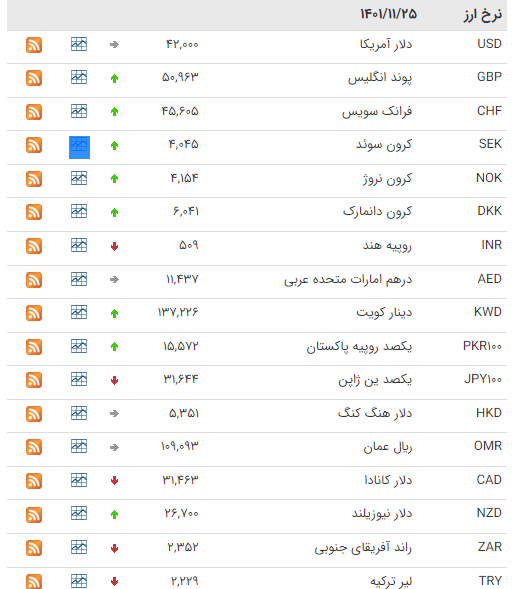 بانک مرکزی امروز سه شنبه (۲۵ بهمن)، نرخ هر دلار را ۴۲ هزار ریال، پوند را ۵۰ هزار و ۹۶۳ و یورو را ۴۵ هزار و ۳ ریال اعلام کرد.