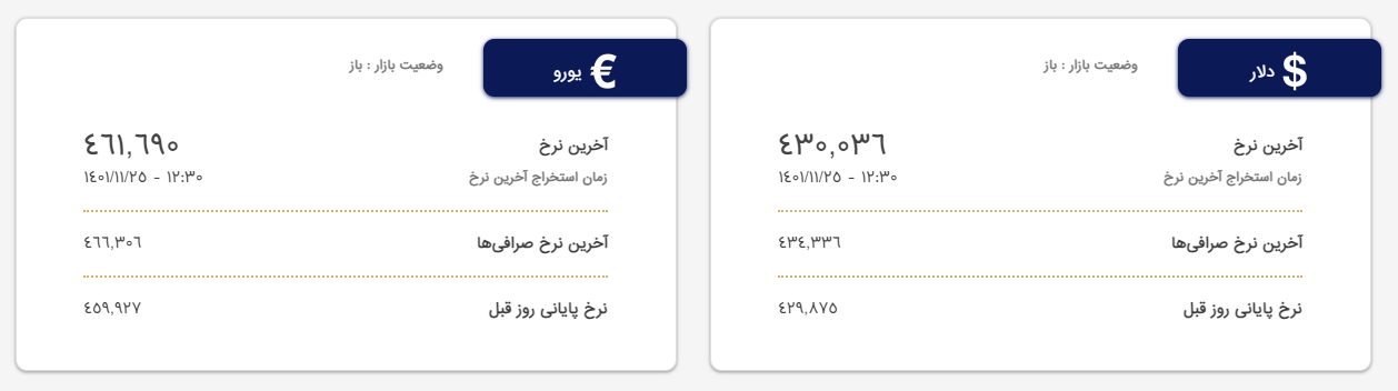 طبق اعلام بانک مرکزی، از روز 1401/11/04 کلیه صرافیها مجازند نسبت به فروش ارز بهصورت اسکناس با نرخ منتشرشده تحت عنوان "آخرین نرخ صرافیها" در سایت مدیریت بازار متشکل معاملات ارز ایران بهآدرس www.ice.ir اقدام نمایند.