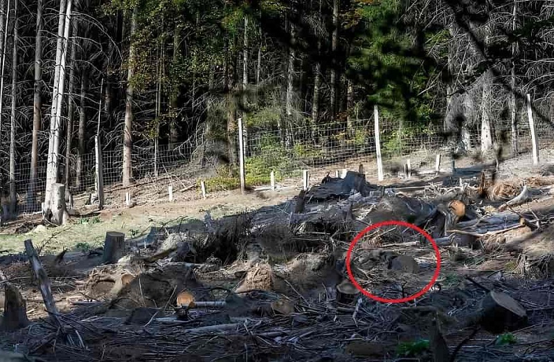 گوزن در سمت راست تصویر، روی زمین تکیه داده است. شاخهایش کامل رشد نکرده است و به همین دلیل است که در نگاه اول تشخیص آن سخت است.