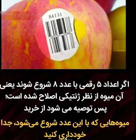 برچسبی که در این تصویر میبینید عدد ۵ رقمی است که با عدد ۸ شروع میشود؛ یعنی این میوه از نظر ژنتیکی اصلاح شده است! پس توصیه میشود از خرید میوههایی که با این عدد شروع میشوند جدا خودداری کنید.