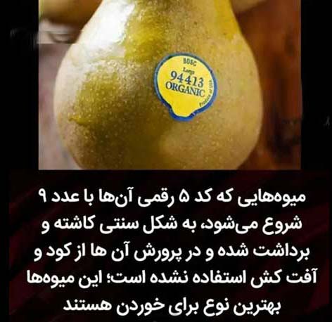 برچسب میوه با عدد ۴ رقمی که با عدد ۳ و ۴ شروع میشود به این معنی است که برای پرورش این میوه از کودهای شیمیایی استفاده شده و اگر فقط عدد ۴ قید شده باشد مفهومش این است که برای تولید محصول از کودهای حیوانی استفاده شده است.