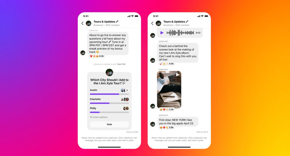 به گزارش سایت طلا،بخش کانالهای اینستاگرام شباهت زیادی به کانالهای تلگرام دارد، مدیران کانالهای اینستاگرام میتوانند مواردی مانند متن، تصاویر، ویدیو را در این کانالها منتشر کنند. مانند تلگرام، کانالهای اینستاگرام هم از واکشن با ایموجی پشتیبانی میکنند.