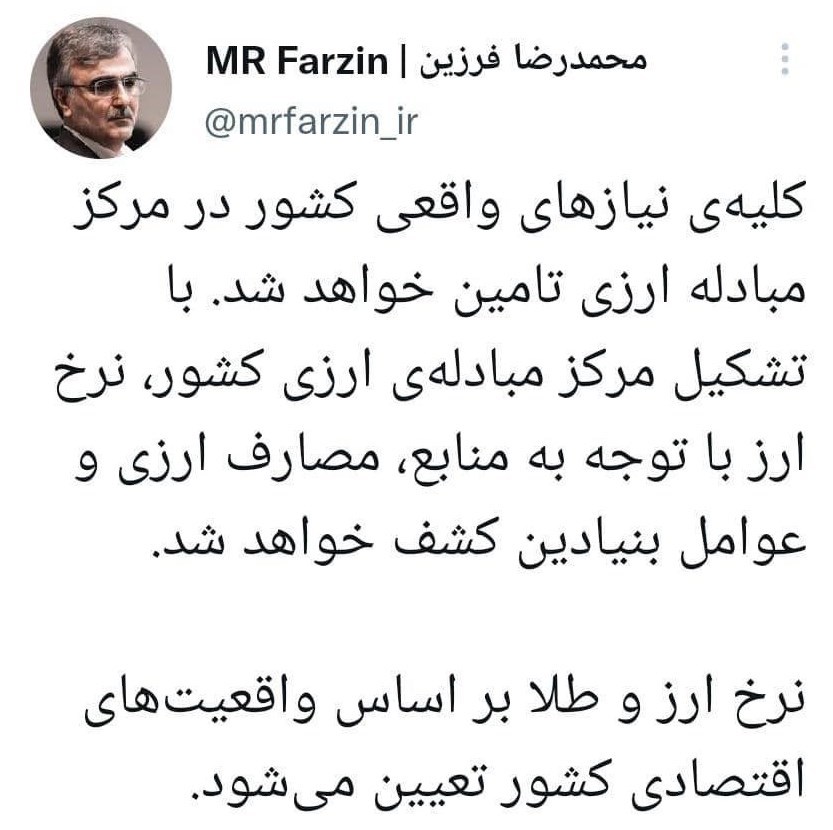 به گزارش سایت طلا، محمدرضا فرزین در پیامی اعلام کرد: کلیهی نیازهای واقعی کشور در مرکز مبادله ارزی تامین خواهد شد. با تشکیل مرکز مبادلهی ارزی کشور نرخ ارز با توجه به منابع مصارف ارزی و عوامل بنیادین کشف خواهد شد.