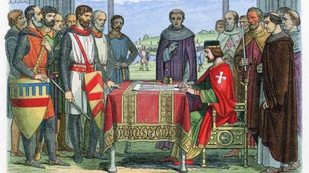 شاه جان، به دلیل هزینه زیاد جنگ با فیلیپ دوم پادشاه فرانسه (فیلیپ اوگوست) و خزانه خالی به جا مانده از ریچارد اول، شروع به جمعآوری مالیات زیاد از واسالهایش کرد. بارونها که از این امر ناخشنود بودند، نارضایتی خود را پس از شکست جان از فیلیپ با شورش خود نشان دادند. شاه جان سرانجام مغلوب بارونها شده و فرمان کبیر یا مگنا کارتا را امضا کرد.